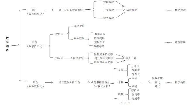 目前,公司整體信息化建設(shè)已初步形成以辦公和業(yè)務(wù)管理系統(tǒng)為前臺依托力、以知識庫平臺為中臺支撐力、以經(jīng)營數(shù)據(jù)分析平臺為后臺驅(qū)動力的“三駕馬車”并駕齊驅(qū)的數(shù)字化運營模式,下一步,公司將圍繞“管理信息化——數(shù)據(jù)資產(chǎn)化——業(yè)務(wù)數(shù)字化”轉(zhuǎn)型路線,不斷促進公司優(yōu)化管理、降本增效和科學(xué)決策,在深入貫徹省委省政府“數(shù)字湖南、數(shù)字政府、數(shù)字社會”戰(zhàn)略進程中,提升“數(shù)字湘咨”品牌影響力,助力“數(shù)字湖南”高質(zhì)量發(fā)展。