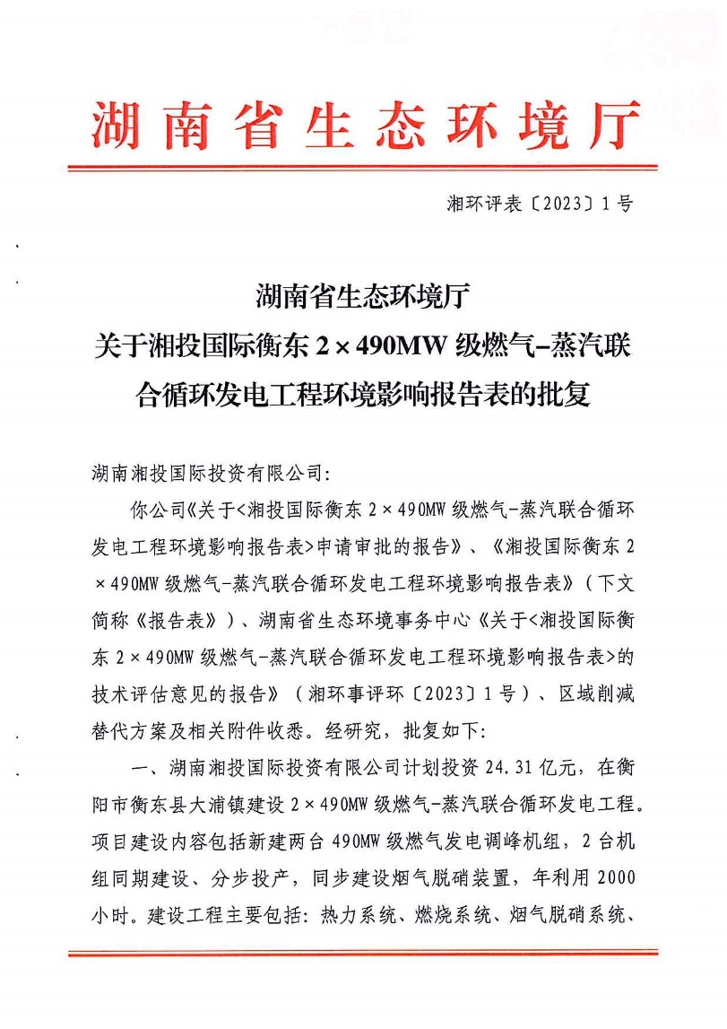 2023年3月9日,由省咨詢公司編制的《湘投國際衡東2×490MW級燃氣-蒸汽聯(lián)合循環(huán)發(fā)電工程環(huán)境影響報告表》順利獲得湖南省生態(tài)環(huán)境廳批復(湘環(huán)評表[2023]1號),為項目后續(xù)依法合規(guī)開工建設奠定了堅實基礎。
