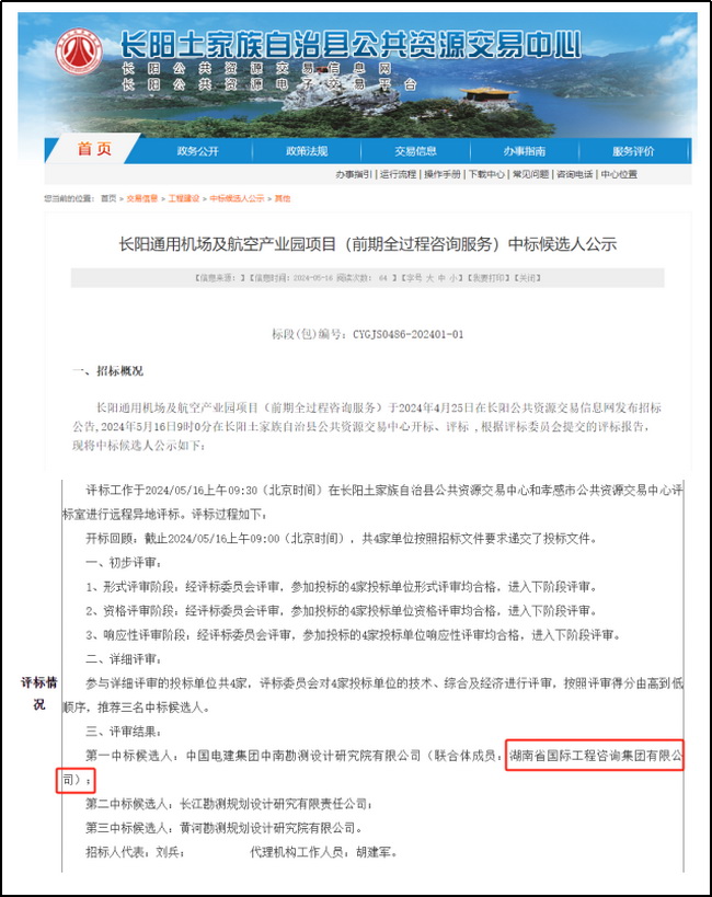 5月16日,湘咨集團與中國電建集團中南勘測設計研究院有限公司(下稱“中國電建中南院”)聯(lián)合體成功中標長陽通用機場及航空產業(yè)園項目(前期全過程咨詢服務),中標金額996.78萬元。