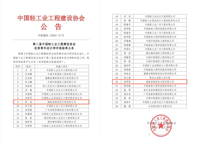 近日,中國輕工業(yè)工程建設(shè)協(xié)會(huì)正式公布了“第二屆中國輕工業(yè)工程建設(shè)協(xié)會(huì)優(yōu)秀青年設(shè)計(jì)師”評選結(jié)果,湘咨集團(tuán)所屬省輕紡院李浩、徐莎莎2名專家榮獲“第二屆中國輕工業(yè)工程建設(shè)協(xié)會(huì)優(yōu)秀青年設(shè)計(jì)師”榮譽(yù)稱號。
